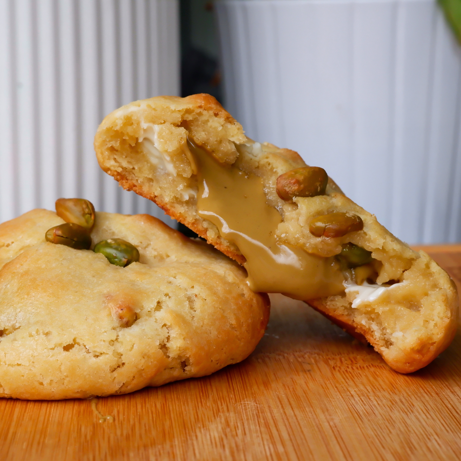 Le cookie généreux de 130 g, fait maison, avec un cœur fondant à la pâte de pistache. À l’extérieur, une pâte artisanale légèrement dorée, parsemée de morceaux de pistache et de chocolat blanc suisse.
